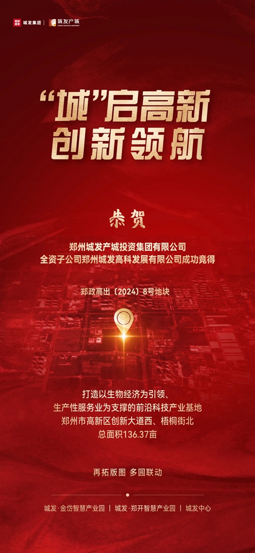 9月29日,鄭州城發(fā)產(chǎn)城投資集團有限公司全資子公司鄭州城發(fā)高科發(fā)展有限公司成功競得鄭政高出〔2024〕8號地塊,該地塊位于鄭州市高新區(qū)創(chuàng)新大道西側、梧桐街北側,為一類工業(yè)用地(小微企業(yè)園用地),總面積136.37畝。